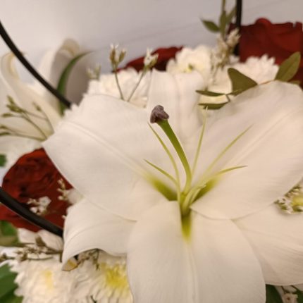 Авторский букет “Окно в сад”: пионовидная лилия, кружевная гвоздика и стойкая альстромерия