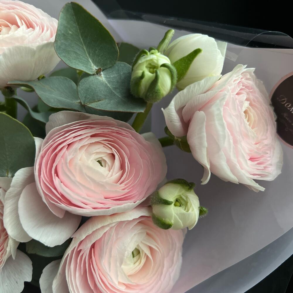 Ранункулюс – 7 шт.Эвкалипт – 3 шт.декоративная упаковка – 1 шт.Атласная лента – 1 шт.