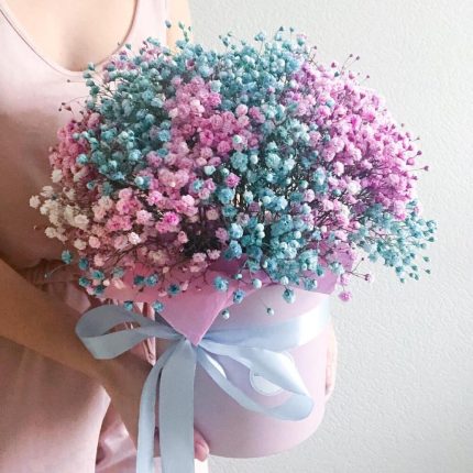 гипсофила цветная – 5 шт.коробка единорог – 1 шт.Тишью – 4 шт.Лента атласная – 1 шт.Оазис флористический – 1 шт.Упаковка транспортировочная пленка – 1 шт.