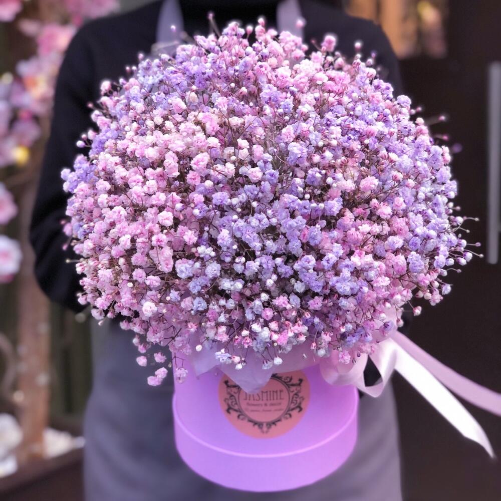 “Сиреневый туман” – композиция из гипсофилы в шляпной коробке