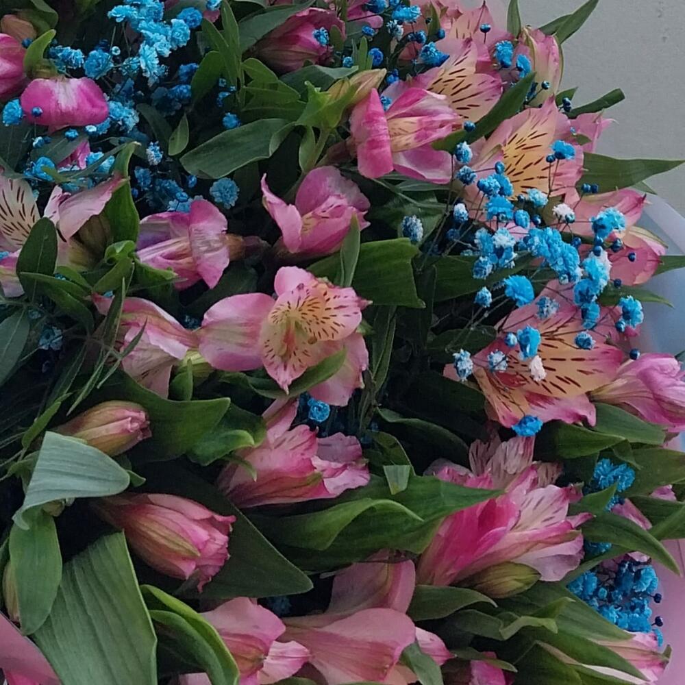 Альстромерия – 15 шт.Лента – 1 шт.Упаковка дизайнерская – 3 шт.фисташка зелень – 10 шт.гипсофила радужная голубая – 3 шт.