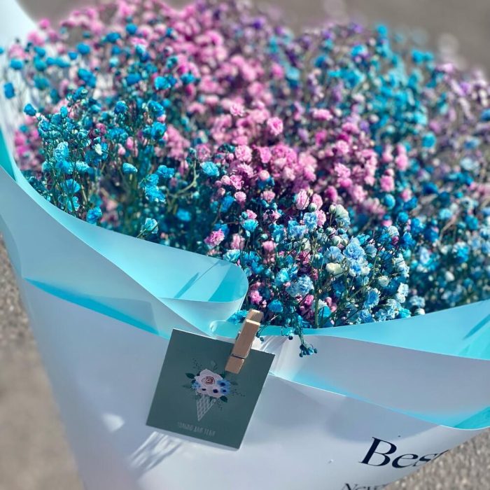Лента атласная – 1 шт.Упаковка дизайнерская – 7 шт.Гипсофила крашеная – 7 шт.