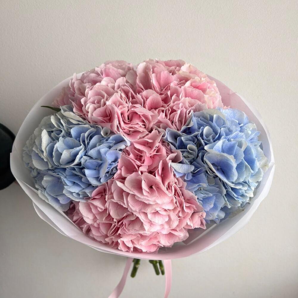 Гортензия розовая – 3 шт.Гортензия голубая – 2 шт.Упаковка дизайнерская – 1 шт.Лента атласная – 2 шт.Открыточка с вашими пожеланиями – 1 шт.хорошее настроение – 100 шт.инструкция по уходу за цветами – 1 шт.коробка переноска – 1 шт.Кризал – 1 шт.