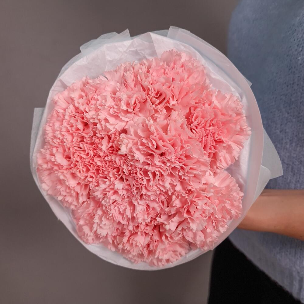 Гвоздика розовая – 11 шт.Упаковка – 1 шт.Аквапак – 1 шт.питательная смесь для срезанных цветов – 2 шт.