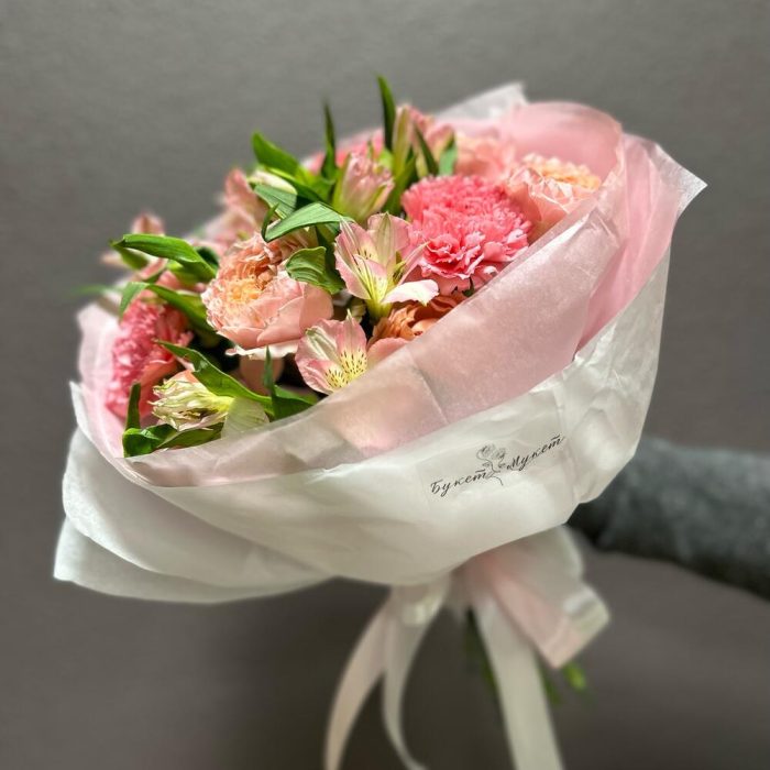 Альстромерия – 4 шт.Лента атласная – 2 шт.Тишью – 4 шт.Диантус – 3 шт.джульетта роза пионовидная – 2 шт.