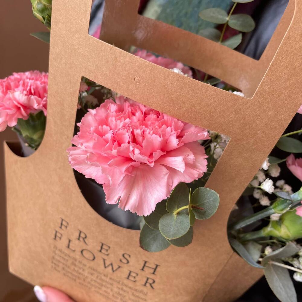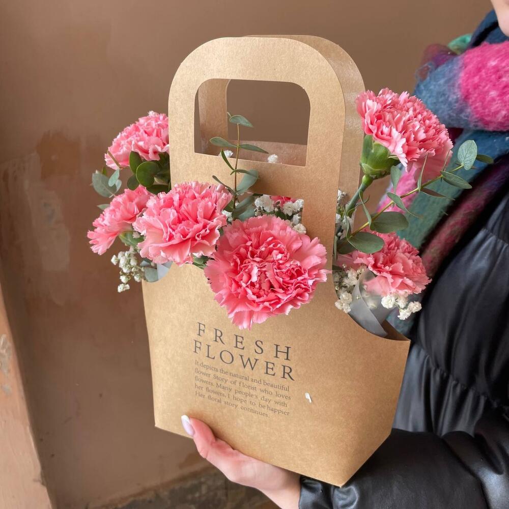 Стойкие гвоздики в крафтовой сумке
