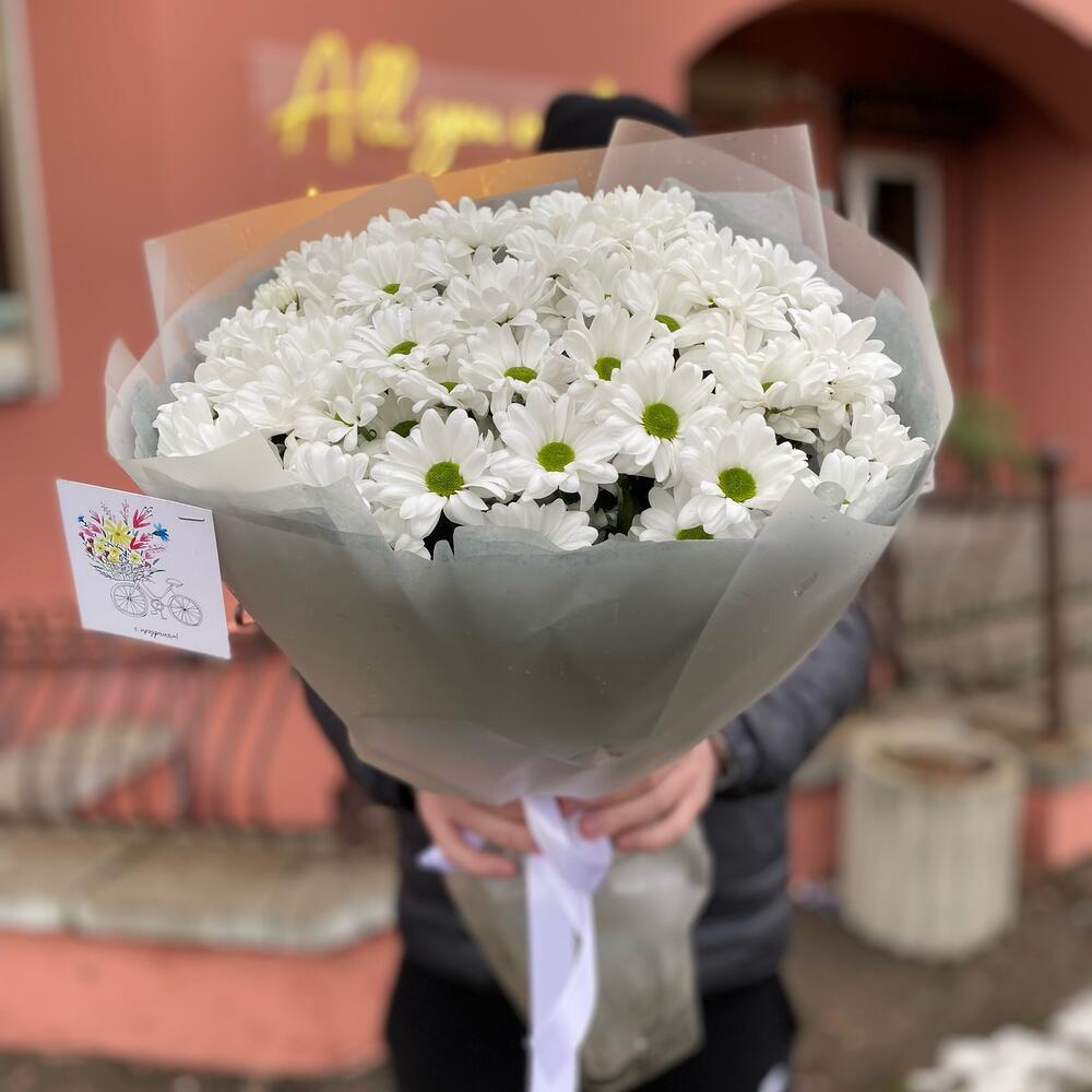 Букет из 11 веток ромашковых хризантем с оформлением , количество ромашек в букете может достигать 101 штуки .