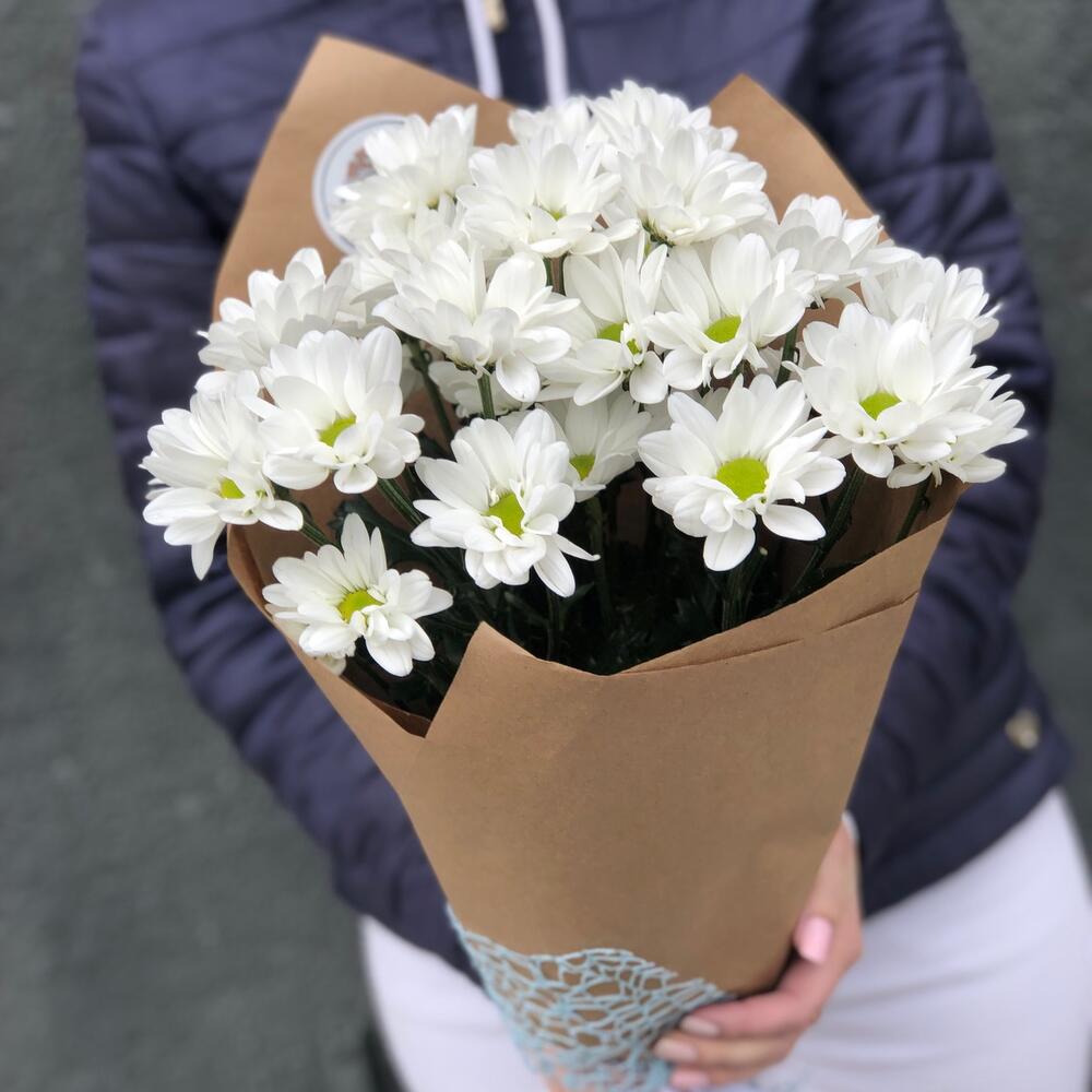 Хризантема кустовая – 3 шт.Лента атласная – 3 шт.Крафт дизайнерский – 2 шт.