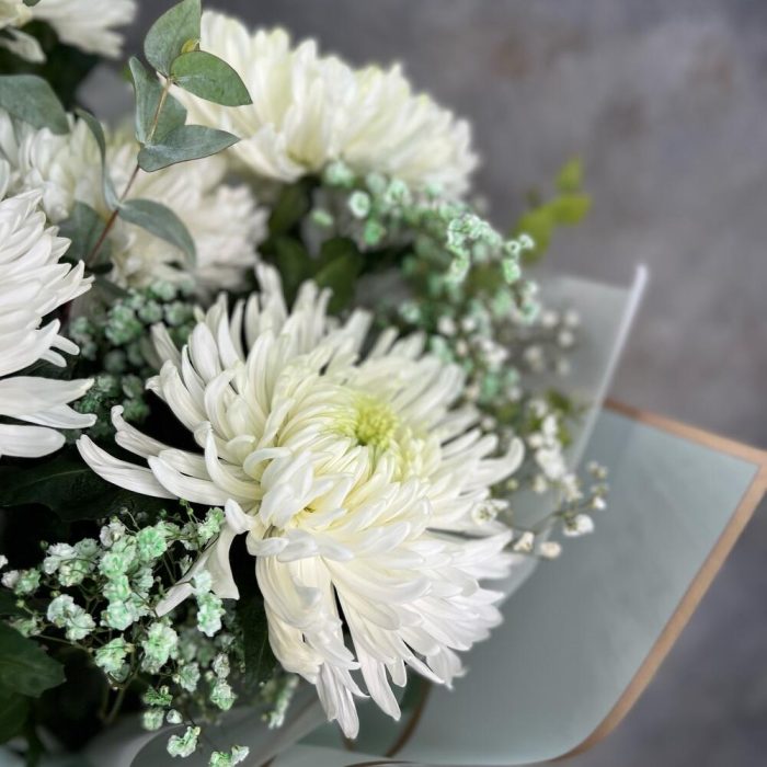 Эвкалипт – 2 шт.Лента атласная – 1 шт.Упаковка дизайнерская – 2 шт.гипсофила радужная – 2 шт.хризантема магнум белая – 5 шт.
