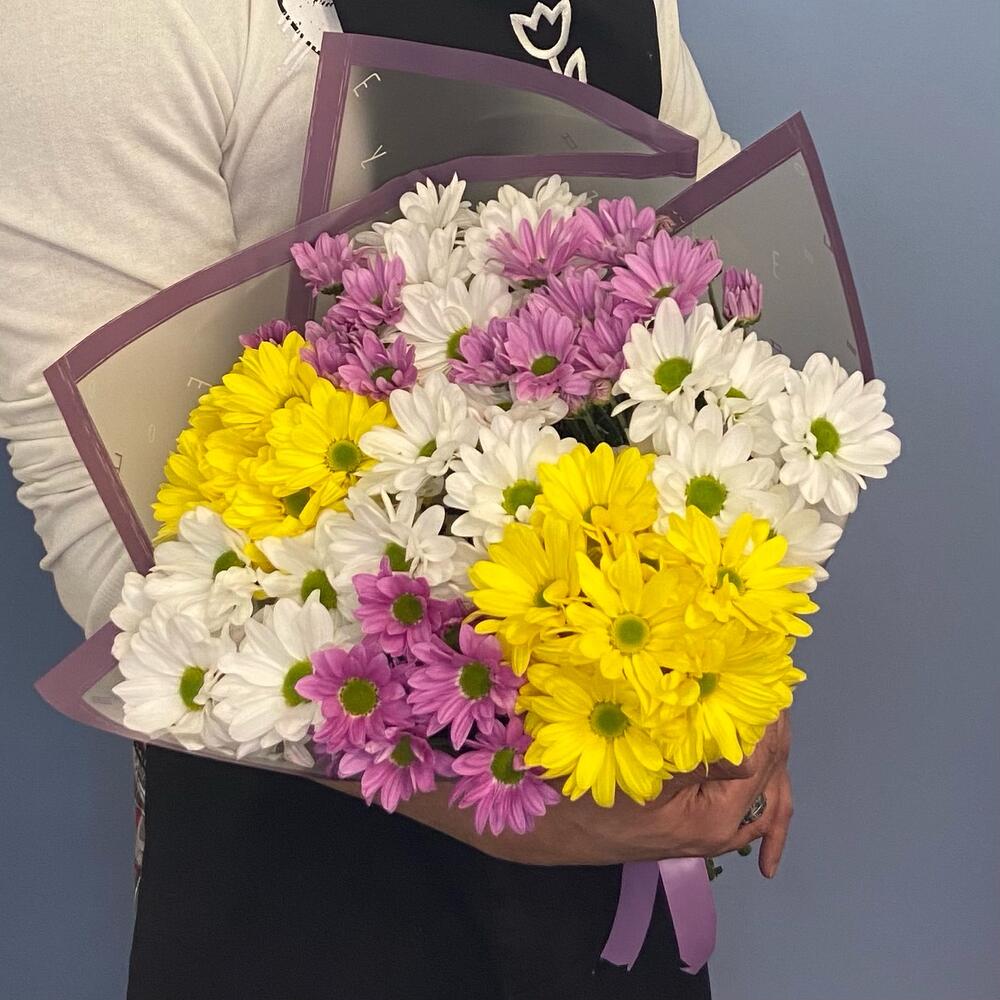 Кустовая хризантема – 9 шт.Упаковка дизайнерская – 1 шт.Лента атласная – 1 шт.