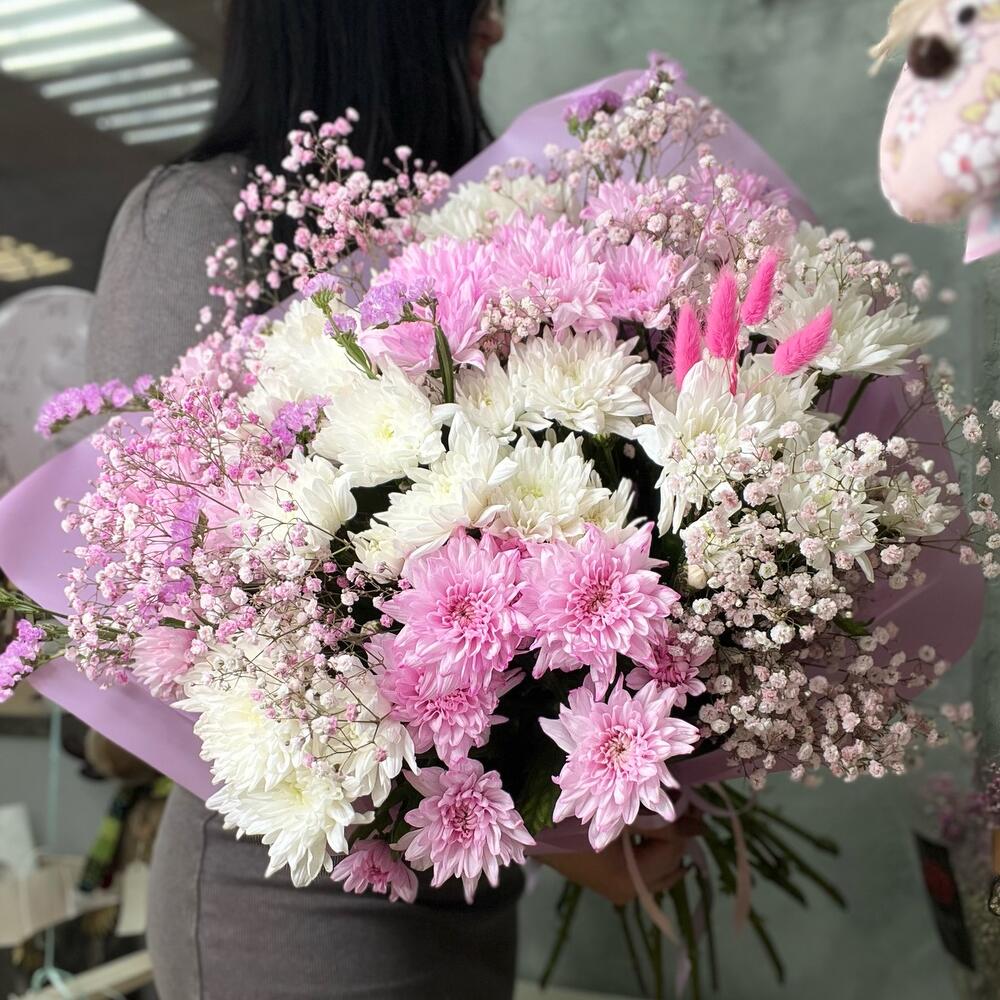 Хризантема кустовая – 13 шт.Статица – 2 шт.гипсофила радужная – 3 шт.Лагурус (сухоцвет) – 5 шт.Упаковка дизайнерская – 2 шт.Лента атласная – 2 шт.