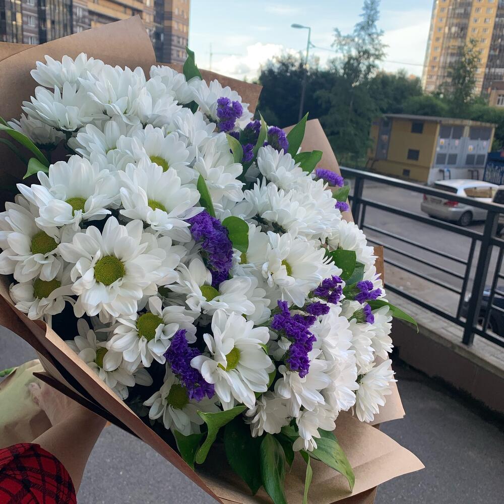 Рускус – 10 шт.Упаковка дизайнерская – 1 шт.Статица синяя – 3 шт.Ромашковая хризантема – 11 шт.
