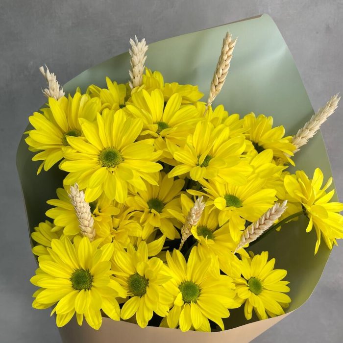 Хризантема кустовая – 3 шт.Упаковка – 1 шт.Пшеница (сухоцвет) – 7 шт.