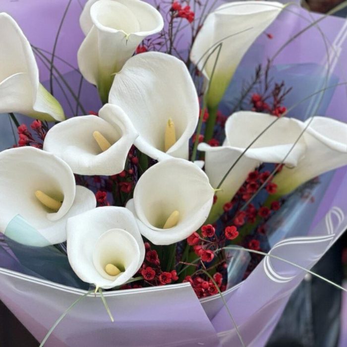 Калла – 11 шт. Хамелациум – 3 шт. Берграсс – 1 шт. Упаковка дизайнерская – 8 шт. Лента – 1 шт.