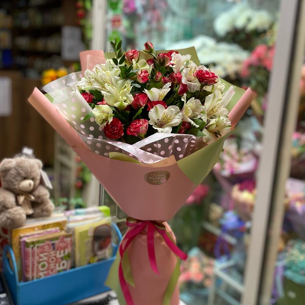 Альстромерия – 7 шт.Роза кустовая – 3 шт.Упаковка дизайнерская – 2 шт.