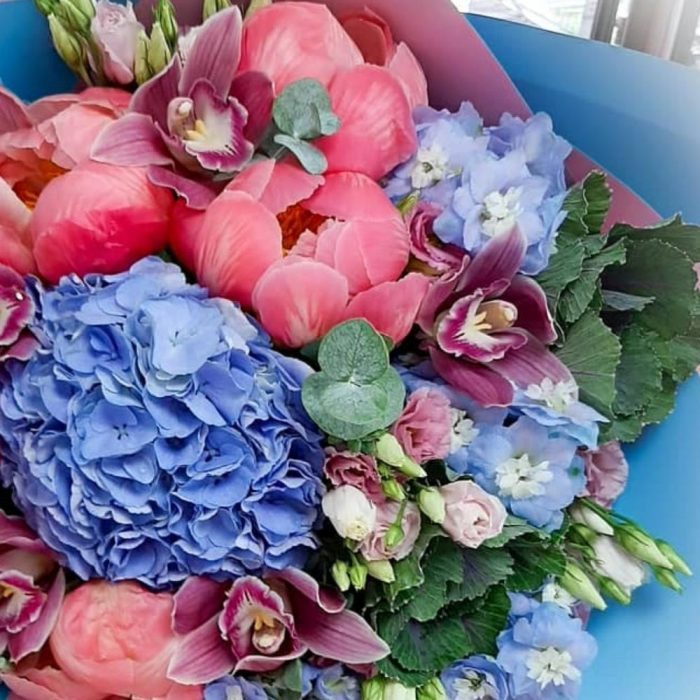 Гортензия – 1 шт.Эустома – 5 шт.Орхидея Цимбидиум – 5 шт.пион или ранункулюс – 5 шт.Дельфиниум – 5 шт.Эвкалипт – 2 шт.Упаковка – 3 шт.Лента атласная – 2 шт.