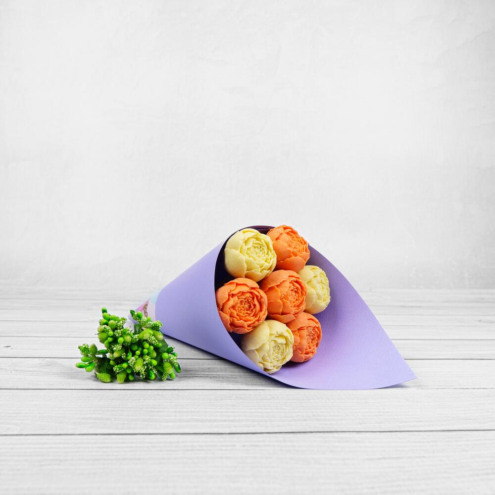 Упаковка Кулек – 1 шт.Прозрачная пленка – 1 шт.шоколадные пионы из бельгийского шоколада – 7 шт.