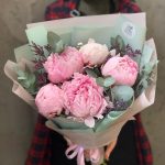 Пион Сара Бернар – 5 шт.Лимониум – 1 шт.Эвкалипт – 1 шт.Упаковка дизайнерская – 1 шт.Лента атласная – 2 шт.