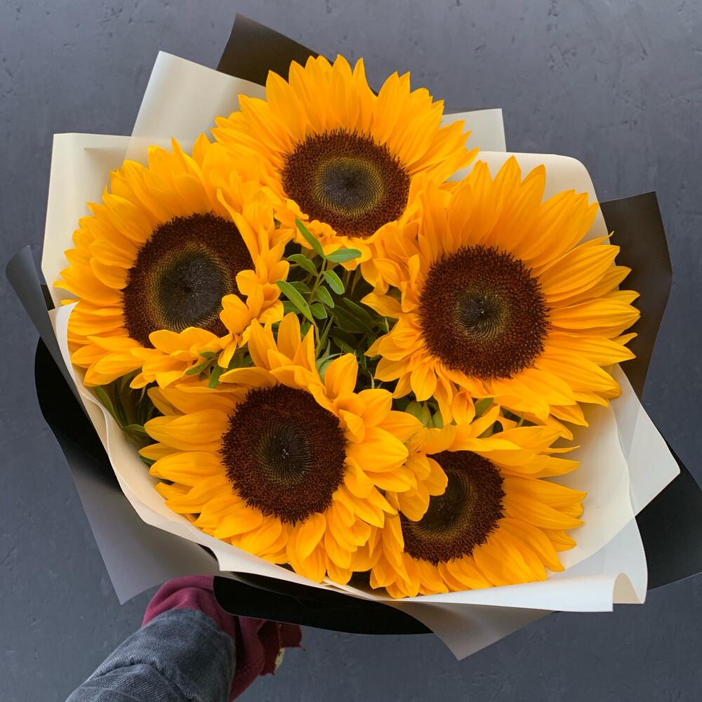 Букет из 5 подсолнухов в стильной упаковке