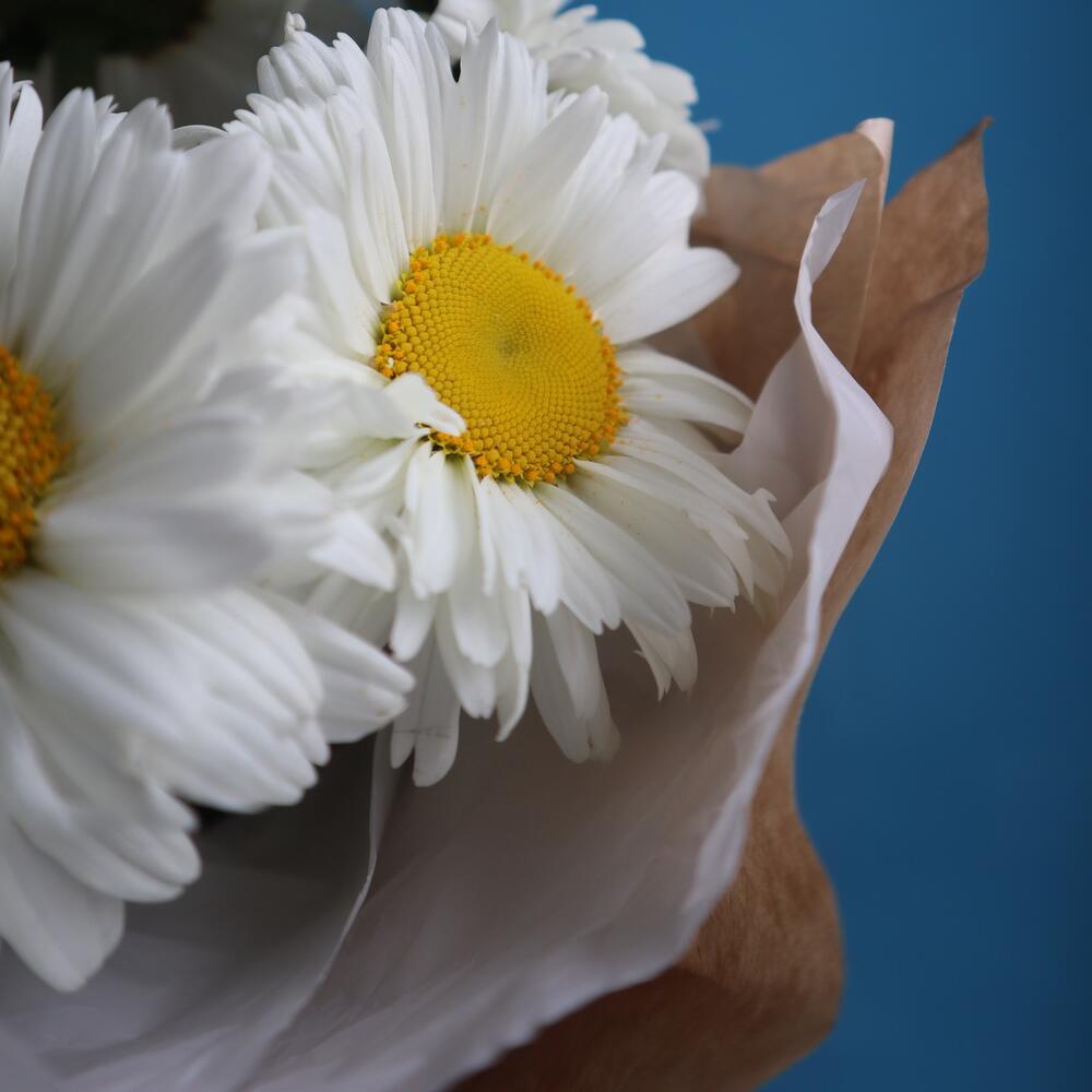 Ромашка полевая – 7 шт.Тишью белое – 2 шт.Крафт мятый – 2 шт.раыия натуральная – 1 шт.
