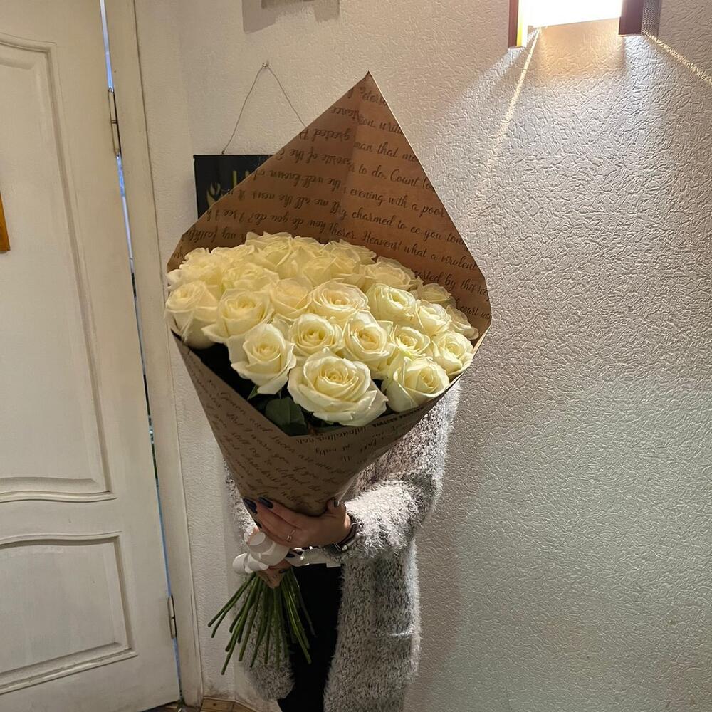 розы эквадор белые – 27 шт.Крафт упаковка – 2 шт.Лента атласная – 1 шт.