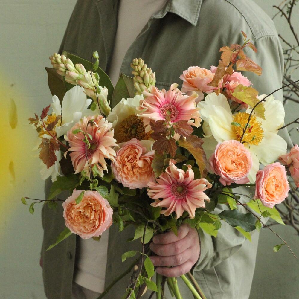 Лента – 1 шт.Пион – 3 шт.Роза кустовая пионовидная – 3 шт.тубироза – 2 шт.пузыреплодник – 3 шт.гербера кучерявая – 3 шт.зелень ветки – 3 шт.