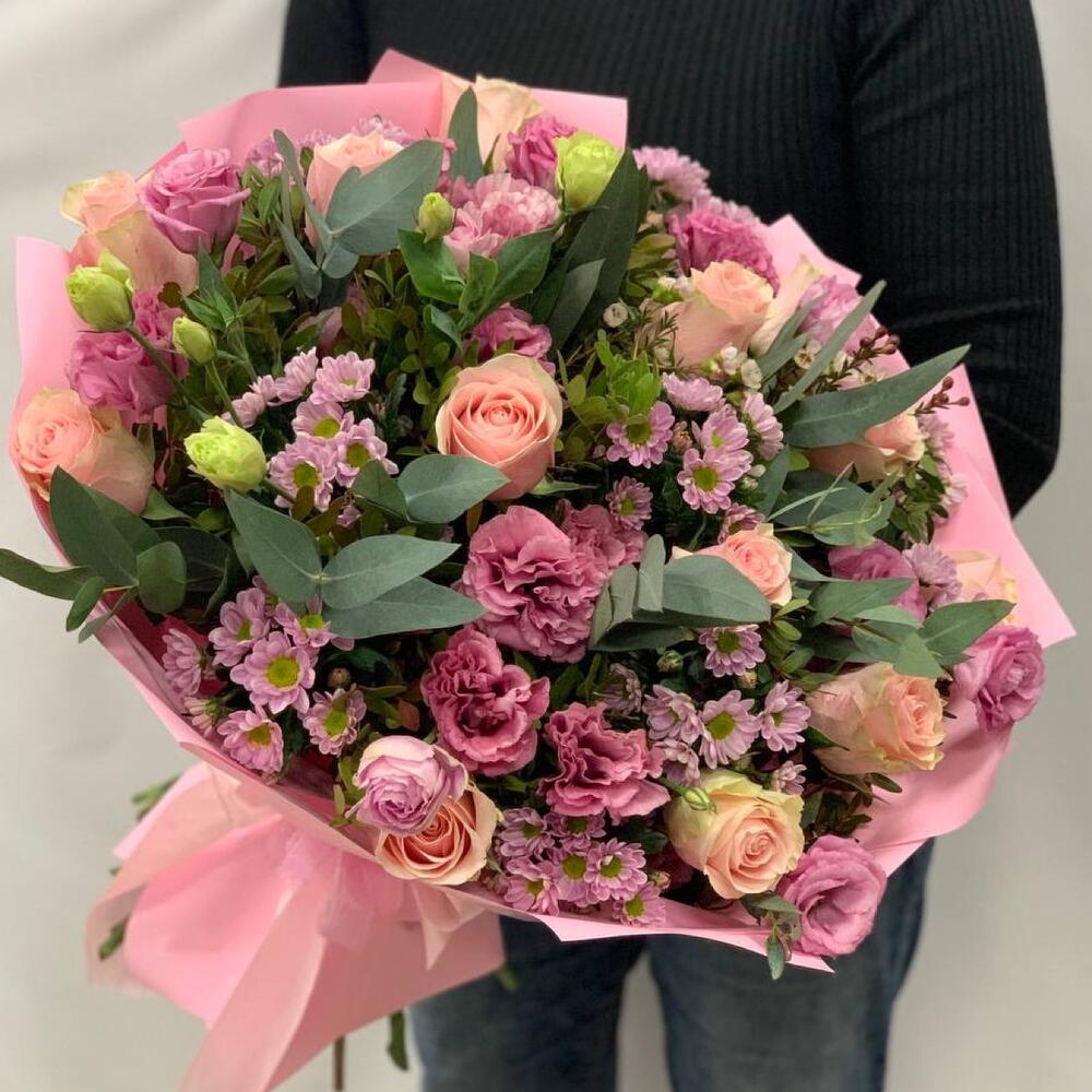 Роза Эквадор – 11 шт.Сантини – 8 шт.Лизиантус – 6 шт.Ваксфлауэр – 2 шт.Фисташка – 5 шт.Эвкалипт – 3 шт.Упаковка дизайнерская – 3 шт.Лента атласная – 1 шт.