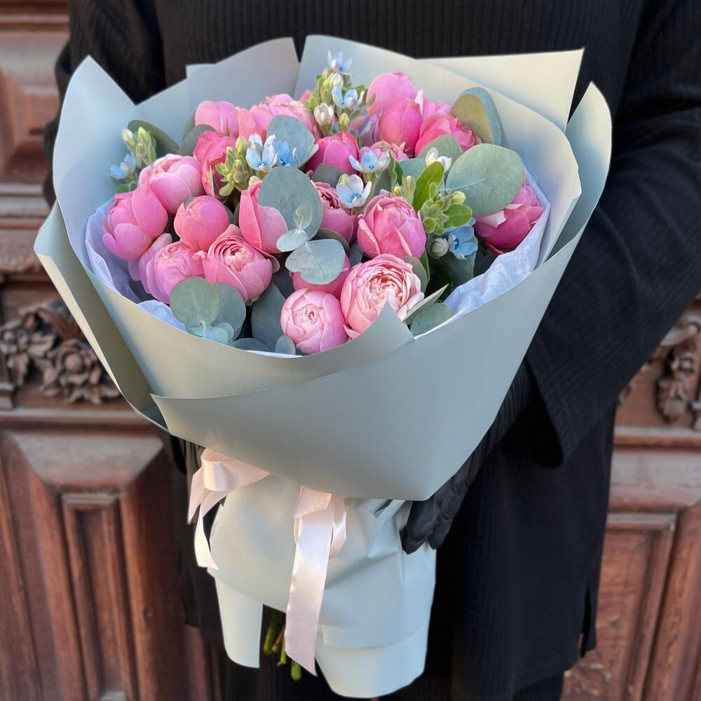 Эвкалипт – 3 шт.Лента атласная – 2 шт.Тишью – 2 шт.Оксипеталум – 5 шт.Пленка матовая – 6 шт.роза кустовая пионовидная сильва пинк – 7 шт.