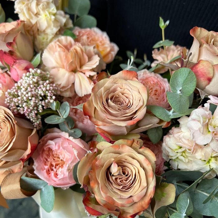 Роза Капучино – 5 шт.Маттиола – 2 шт.Роза кустовая пионовидная джульетта – 1 шт.Озотамнус – 2 шт.Диантус – 3 шт.Эвкалипт – 3 шт.Оазис флористический – 1 шт.бумага дизайнерская – 1 шт.Коробка шляпная – 1 шт.Лента атласная – 2 шт.