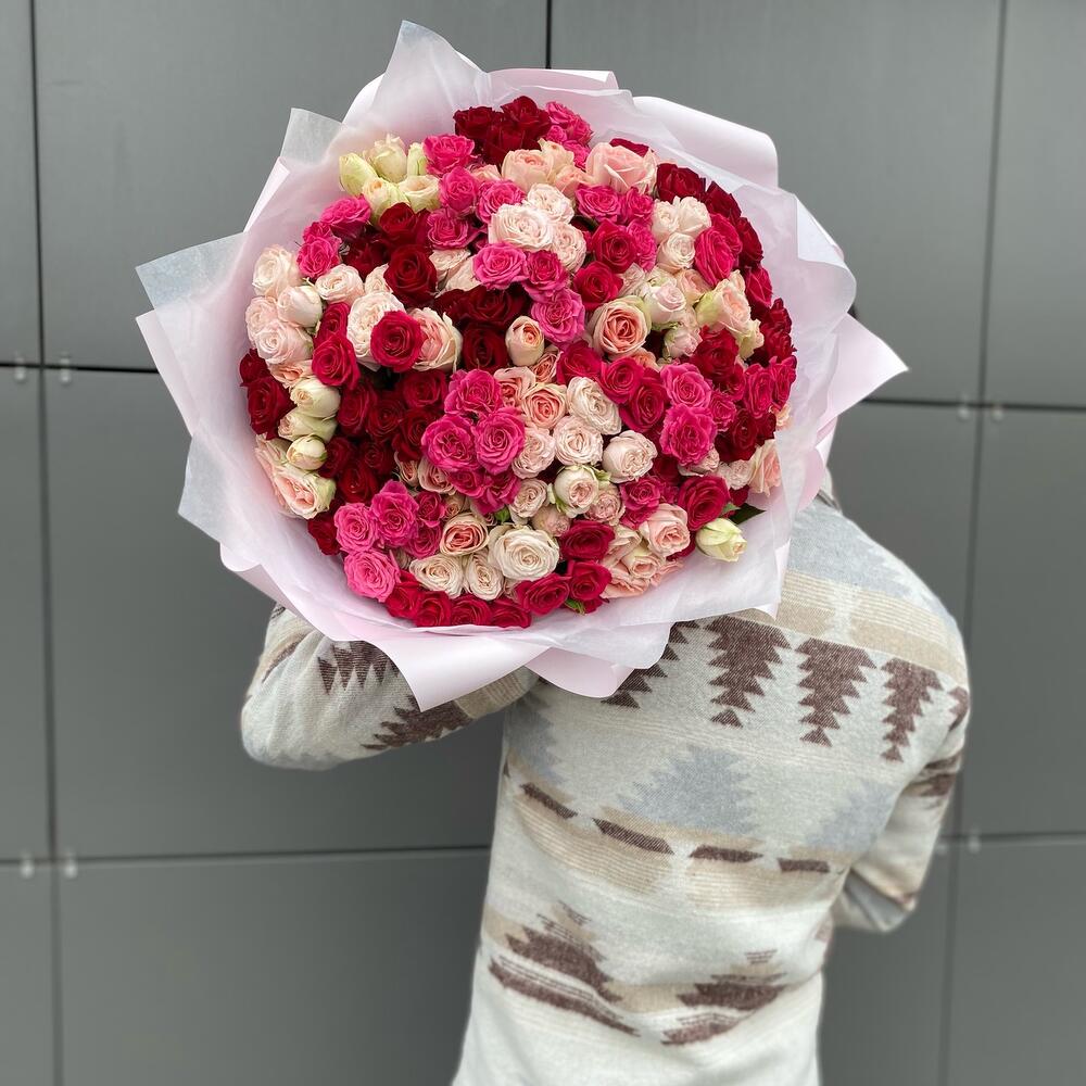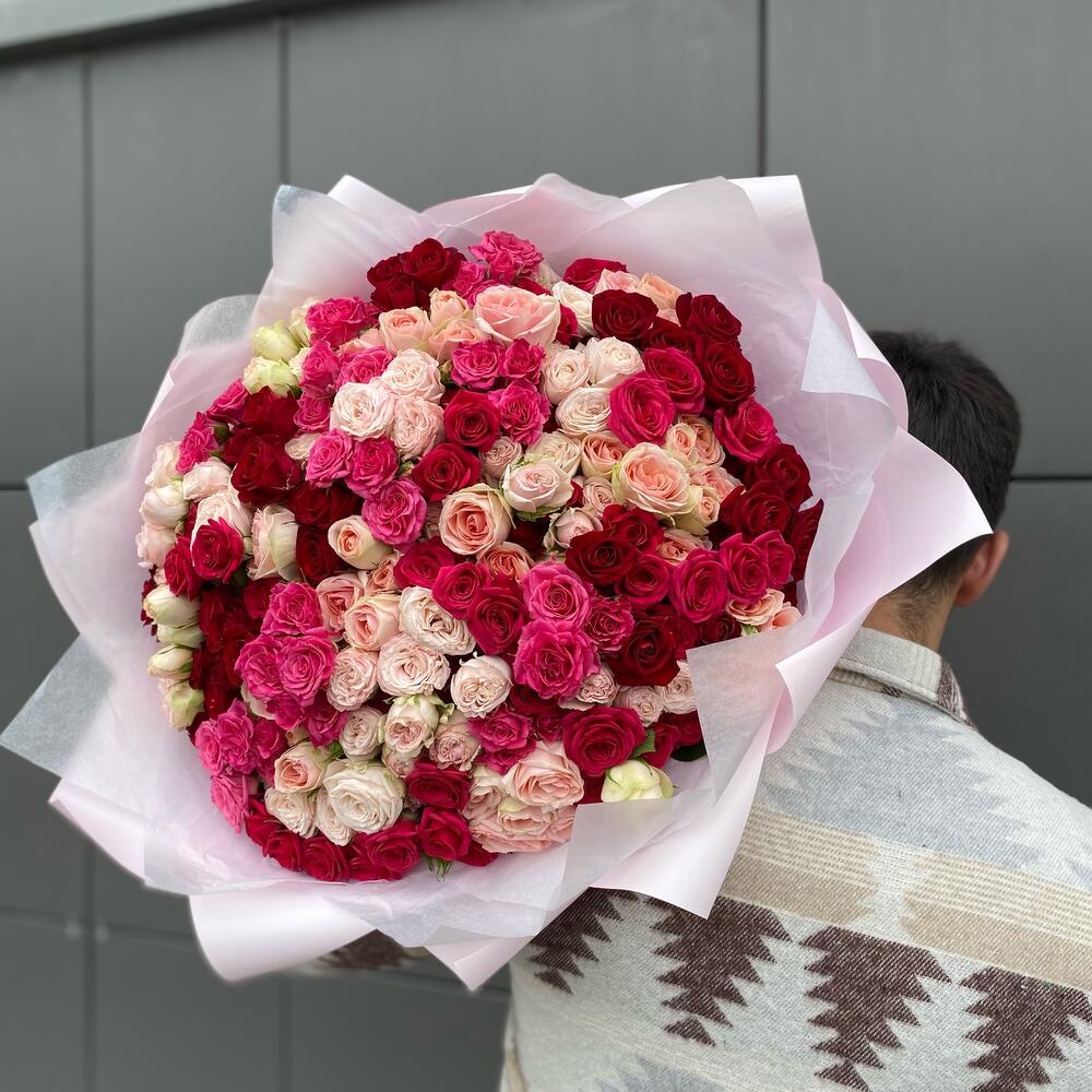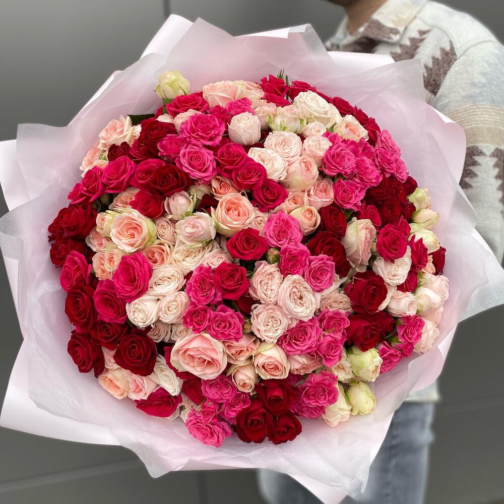 Букет из 41 ветки кустовых роз разных сортов . Количество бутонов(роз) в букете может достигать 281 штуку.