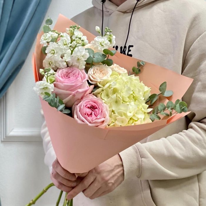 Гортензия – 1 шт.Эвкалипт – 2 шт.Роза кустовая бежевая – 1 шт.Пленка матовая – 1 шт.маттиола кустовая белая – 1 шт.роза пинк охара(ароматная) – 2 шт.