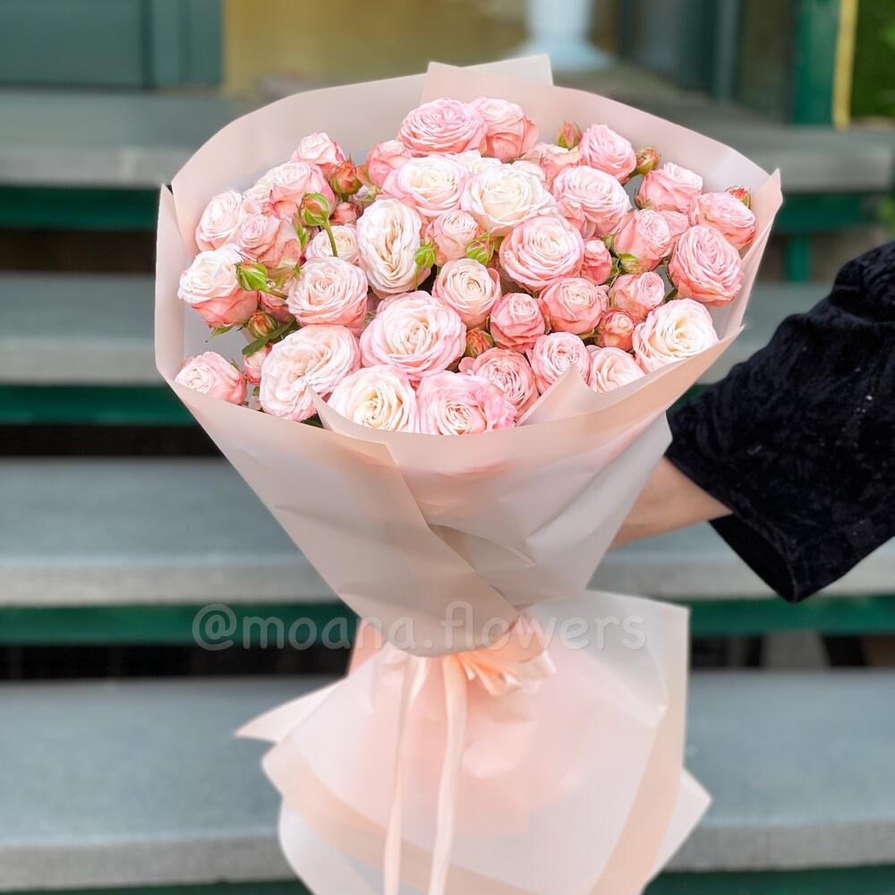 Роза пионовидная розовая – 51 шт.Упаковка дизайнерская – 2 шт.Лента атласная – 2 шт.Открыточка с вашими пожеланиями – 1 шт.хорошее настроение – 100 шт.инструкция по уходу за цветами – 1 шт.коробка переноска – 1 шт.Кризал – 1 шт.