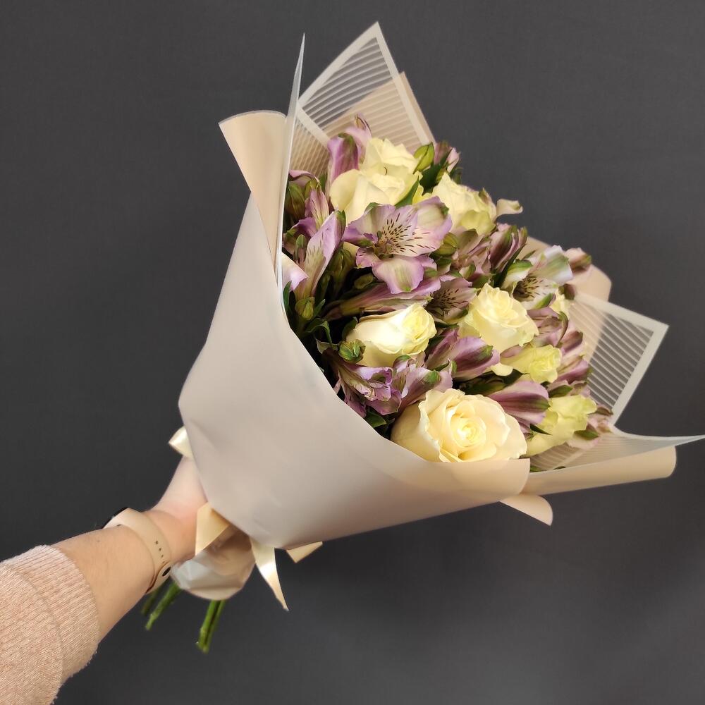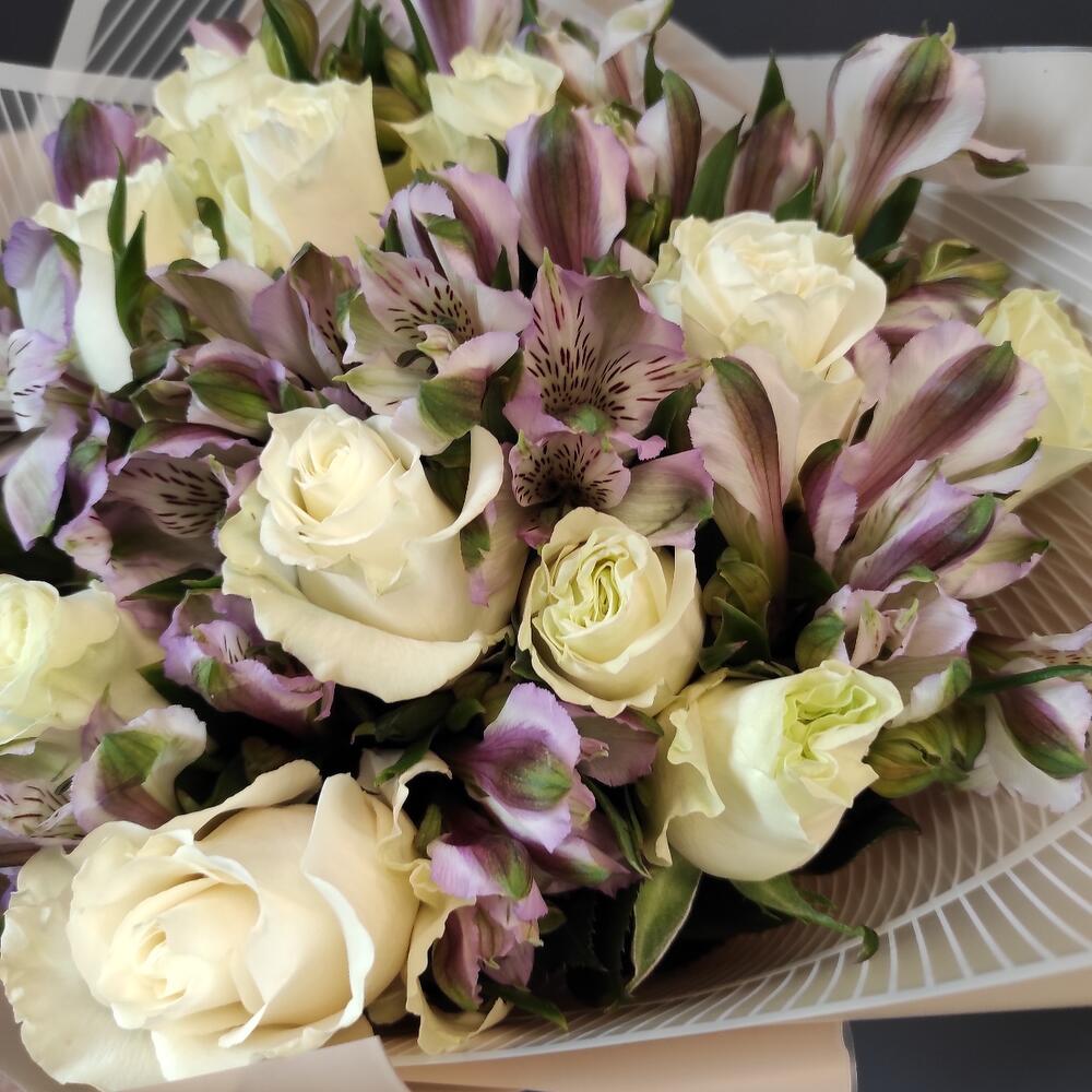 Букет из белых роз и фиолетовых альстромерий М