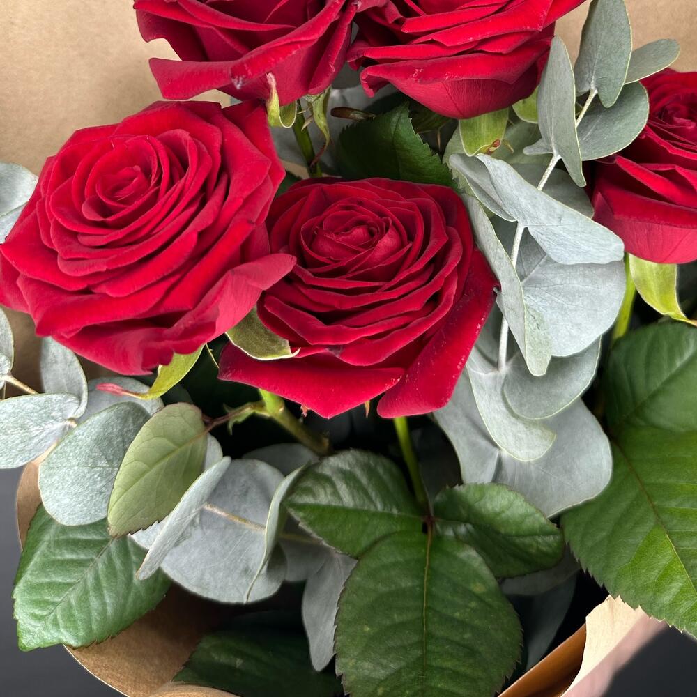 Букет из красных роз и ароматного эвкалипта