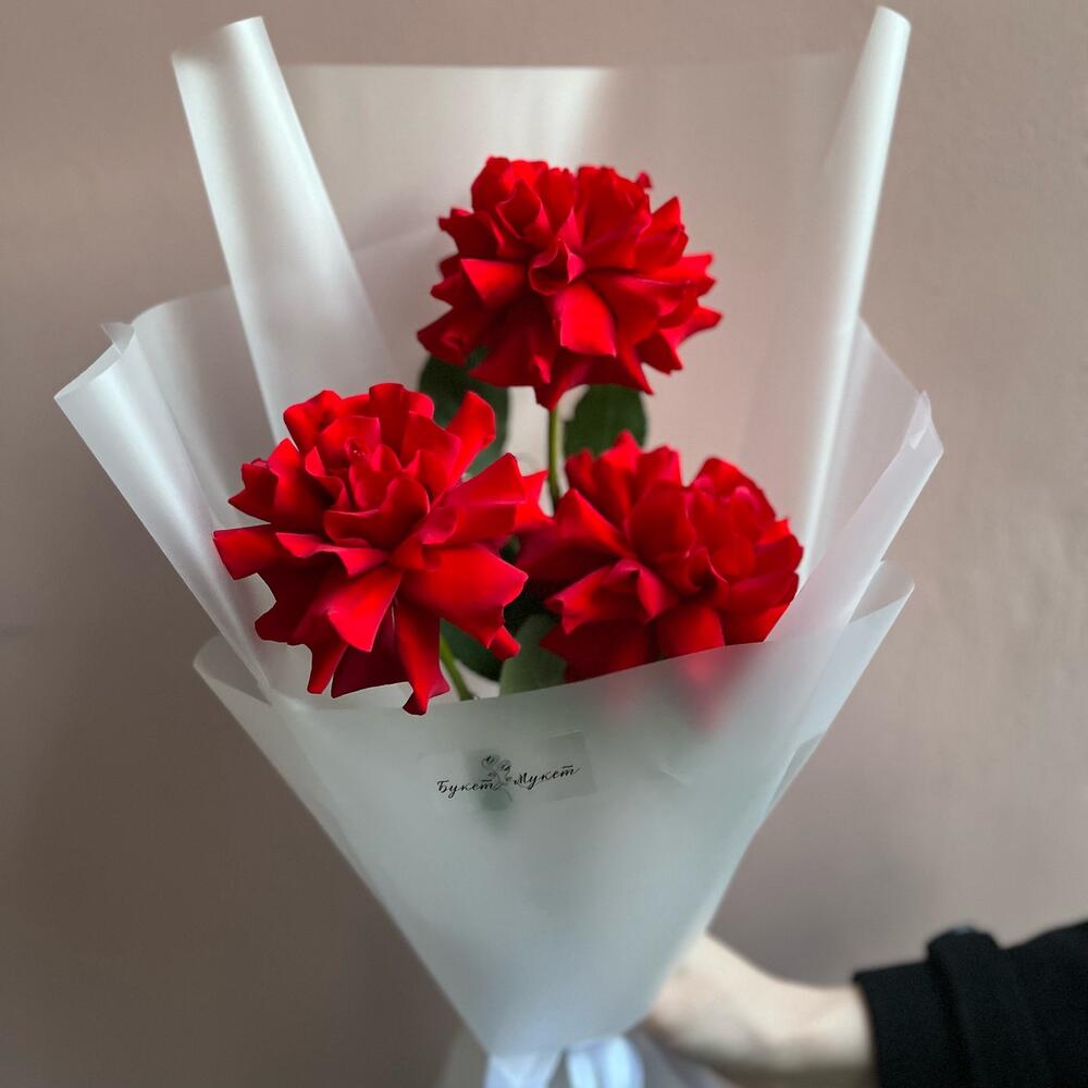 Роза красная – 3 шт.Лента атласная – 1 шт.Пленка матовая – 2 шт.
