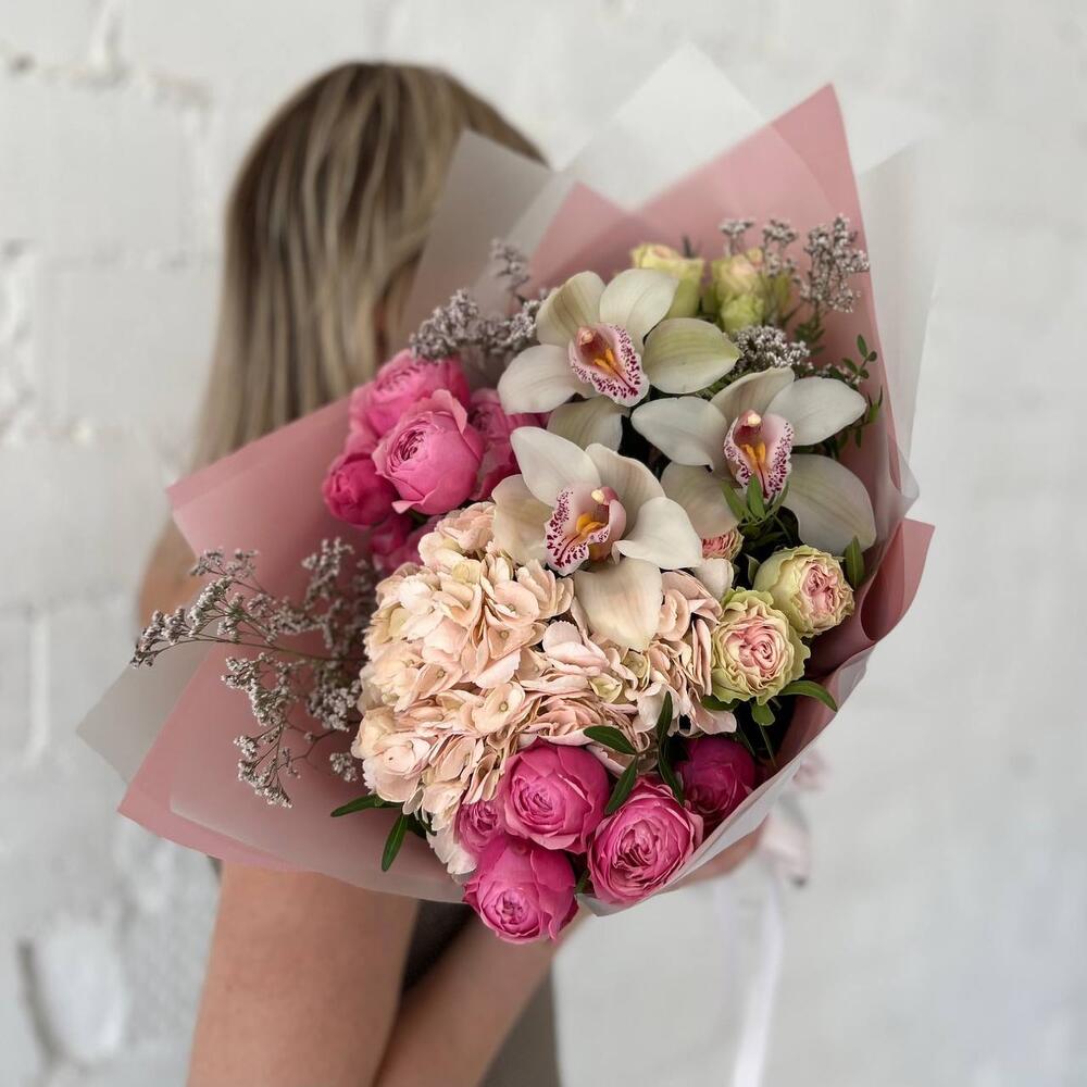 Гортензия – 1 шт.Лимониум – 3 шт.Роза кустовая – 2 шт.орхидея – 3 шт.Кустовая пионовидная роза – 2 шт.Упаковка дизайнерская – 3 шт.