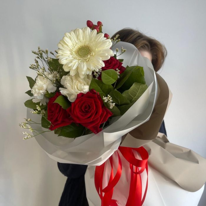 Гиперикум – 1 шт.Лимониум – 1 шт.Роза красная – 3 шт.Гвоздика – 2 шт.Гербера – 1 шт.Салал листья – 2 шт.Пленка матовая – 6 шт.