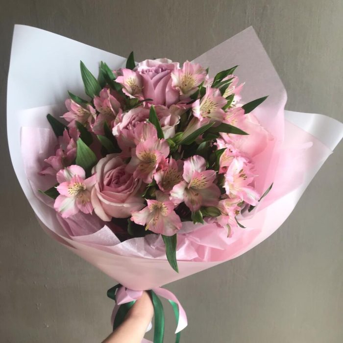 Альстромерия – 6 шт.Роза – 5 шт.Лента атласная – 2 шт.Тишью – 1 шт.Пленка матовая – 1 шт.
