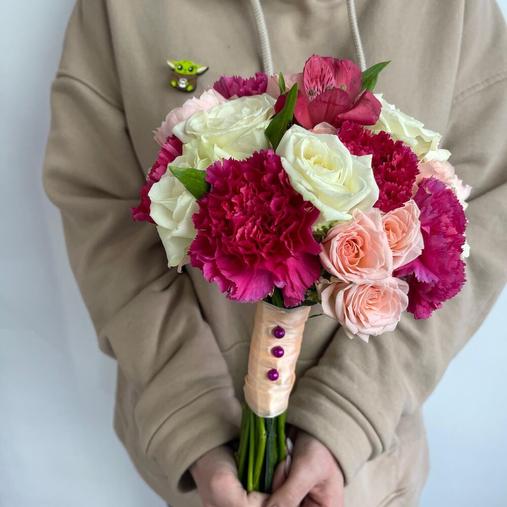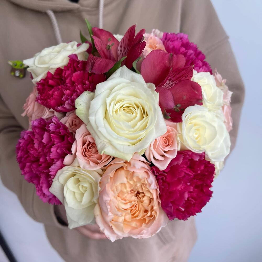 Кустовая роза – 5 шт.Диантус – 5 шт.белая роза – 9 шт.джульетта – 2 шт.