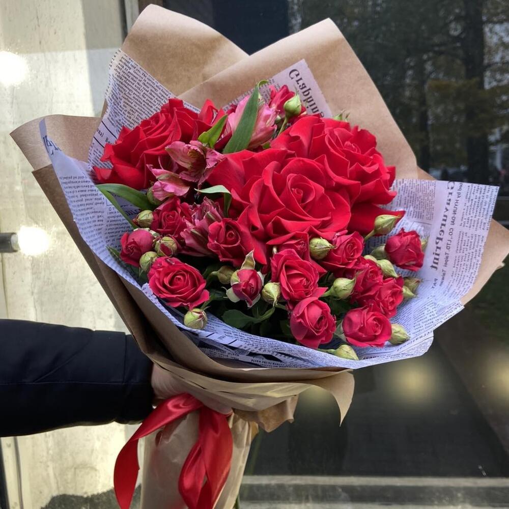 Альстромерии, Гвоздики, Кустовые розы, Лизиантусы, Розы, Хризантемы