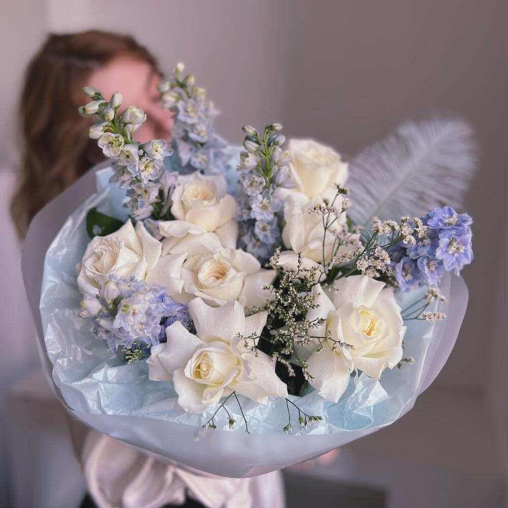 Дельфиниум – 5 шт.Лимониум – 3 шт.Упаковка дизайнерская – 1 шт.Французская роза – 7 шт.перо декоративное – 1 шт.