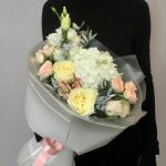 Альстромерия – 1 шт.Гортензия – 1 шт.Кустовая роза – 2 шт.Эустома – 1 шт.Лента атласная – 1 шт.Фисташка – 2 шт.Пленка матовая – 2 шт.роза шарман – 2 шт.роза кендлайт эквадор – 2 шт.