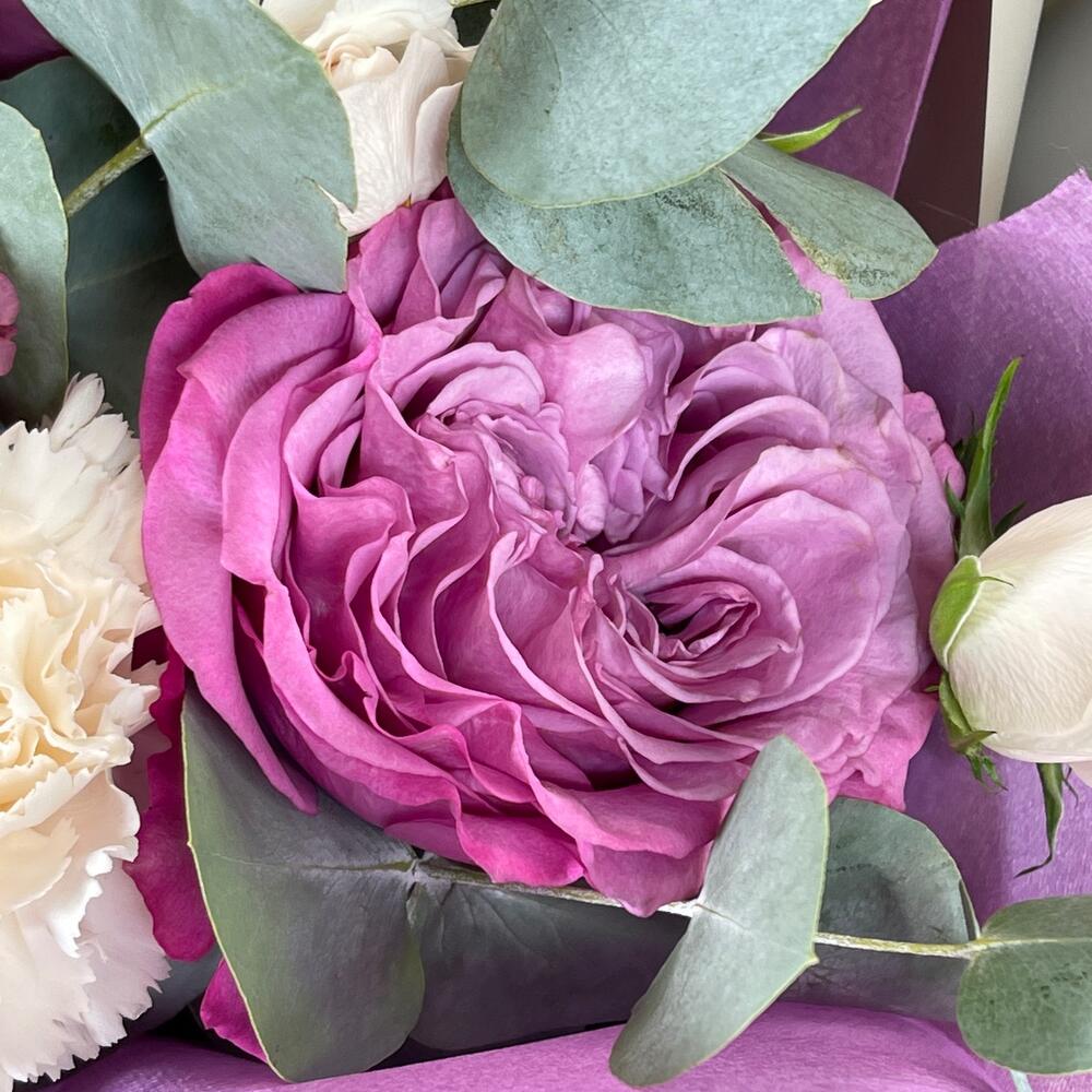 Букет с молочной гвоздикой «Черничный йогурт»
