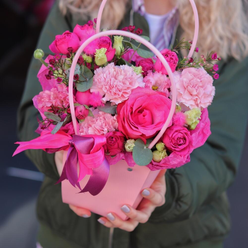 Яркая, чувственная и воздушная композиция, выполненная из малиновых роз, лизиантуса, гвоздик и ваксфлауэра.Такая композиция точно понравится яркой и энергичной получательнице, и будет долго радовать её.К композиции прилагается открытка с вашими пожеланиями и приятный комплимент от нашего магазина – шоколадка. Мы также будем рады отправить вместе с композицией конфеты, шоколад ручной работы или б/а вино по вашим пожеланиям, просто напишите нам в личные сообщения. Заказывая нашу композицию, Вы всегда получите исключительный сервис и заботу о клиенте