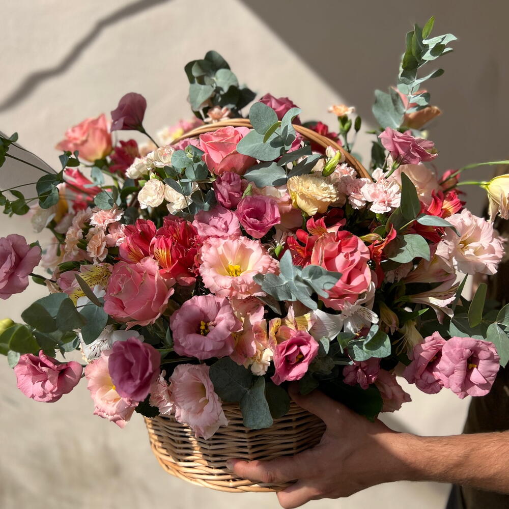 Гвоздики, Лизиантусы, Розы, Тюльпаны