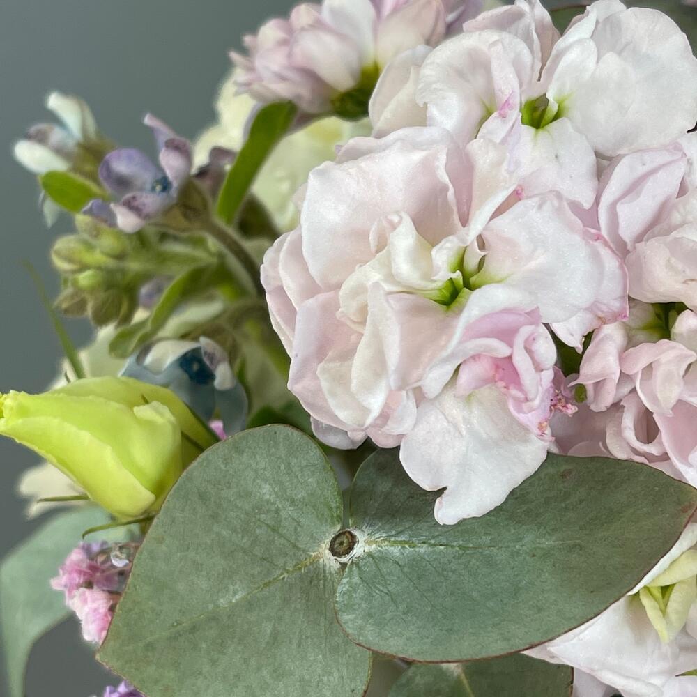Лента – 1 шт.Маттиола – 1 шт.Роза кустовая – 2 шт.Эвкалипт – 1 шт.Роза одноголовая – 1 шт.Гвоздика – 1 шт.Коробка шляпная – 1 шт.Сантини – 1 шт.Оксипеталум – 2 шт.