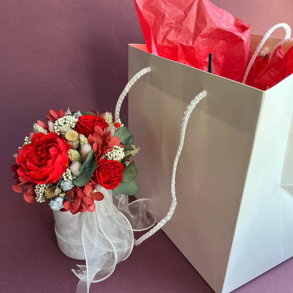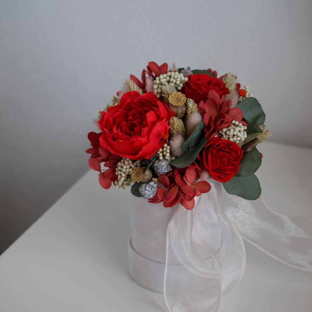 Композиция из сухоцветов и стабилизированных цветов в шляпной коробке (красная)