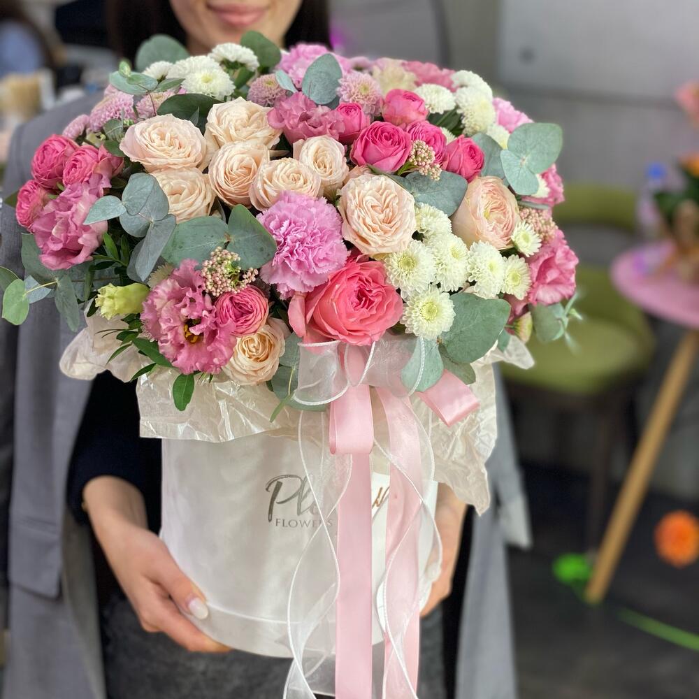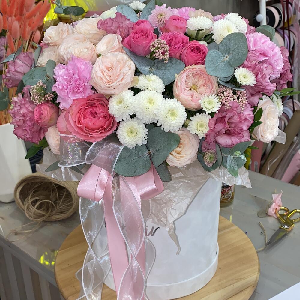 Коробка – 1 шт.Кустовая роза – 5 шт.Хризантема кустовая – 3 шт.Диантус – 5 шт.Роза – 5 шт.Эвкалипт – 3 шт.Оазис флористический – 2 шт.