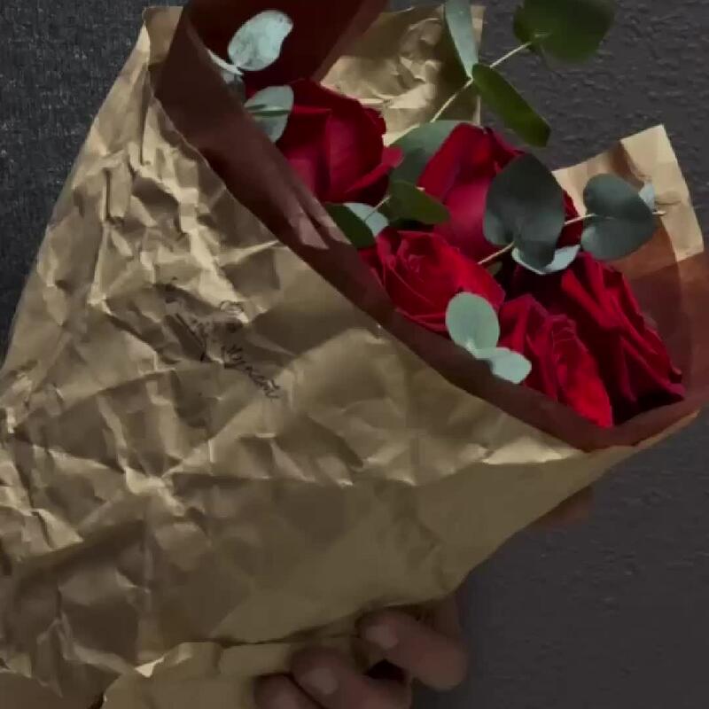 Лента – 1 шт.Эвкалипт – 1 шт.Тишью – 1 шт.Крафт – 1 шт.Красная роза – 5 шт.