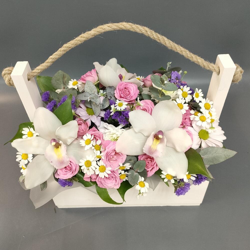 Ящик деревянный – 1 шт.Оазис флористический – 1 шт.Рускус сочи – 3 шт.Эвкалипт – 1 шт.Роза кустовая – 3 шт.Матрикария – 1 шт.Статица – 1 шт.Орхидея Цимбидиум – 3 шт.